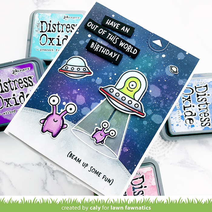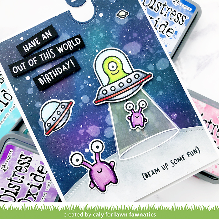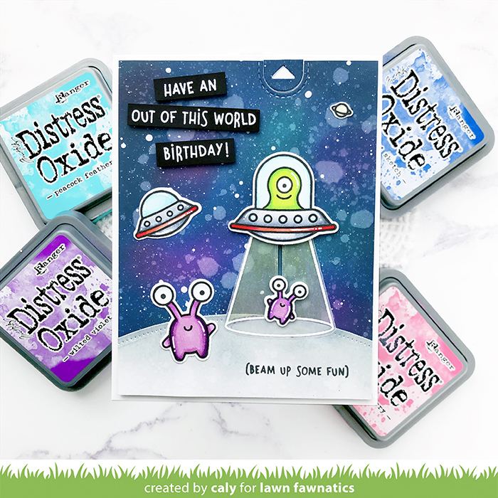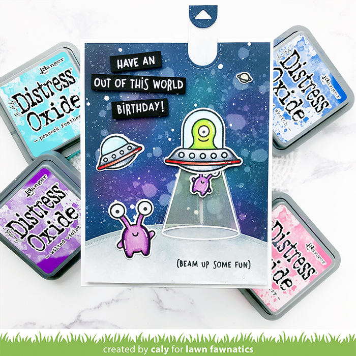 Today’s card is an interactive pull-tab card. I started by creating my galaxy background. I started with white cardstock and ink-blended imperfect and random spots of bright colors using Peacock Feathers, Picked Raspberry, and Wilted Violet Distress Oxide Inks. After my “spots” were in place, I covered the remaining white areas of my white panel with Blueprint Sketch Distress Oxide Ink. Then to add more depth, I ink-blended around the outer edge with Black Soot. To further enhance the look of my galaxy, I splattered my panel with water and then splattered with lots of white ink.