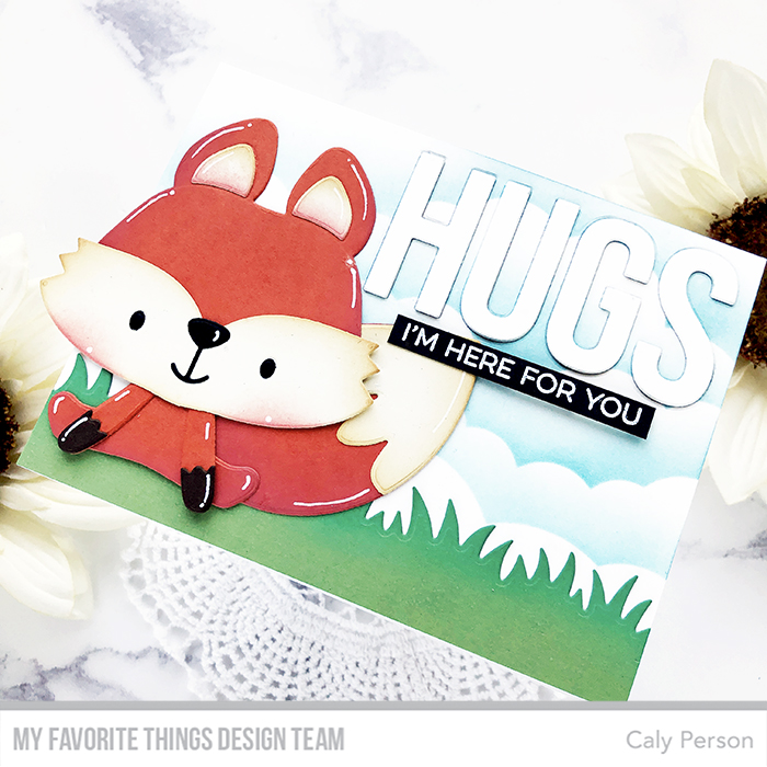 My fox is die-cut from various MFT cardstock, which I will link below. I decided I wanted to fill the space to the right, so I used the Big Hugs Die-namics, which pushed my fox off the side a little bit. I don’t mind that sometimes, because I think it makes the card a bit more interesting.