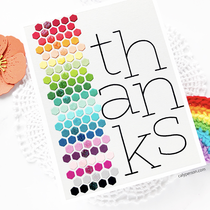 The sentiment is from the Big Thanks stamp set. The letters are not stationary (or one piece), so I was able to squeeze them in to fit perfectly in the space to the right of my rainbow panel.