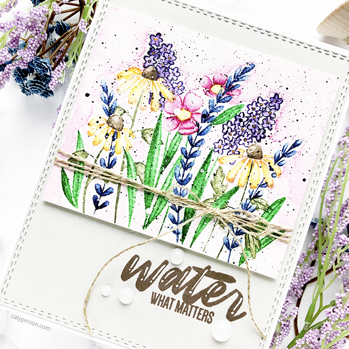 When I was done painting, I splattered the panel with white and then black ink. After it was dry, I trimmed the panel down to mat my card panel. I used some thin baker’s twine to wrap around the watercolored panel before adhering it over the card panel with foam adhesive to give it some dimension.