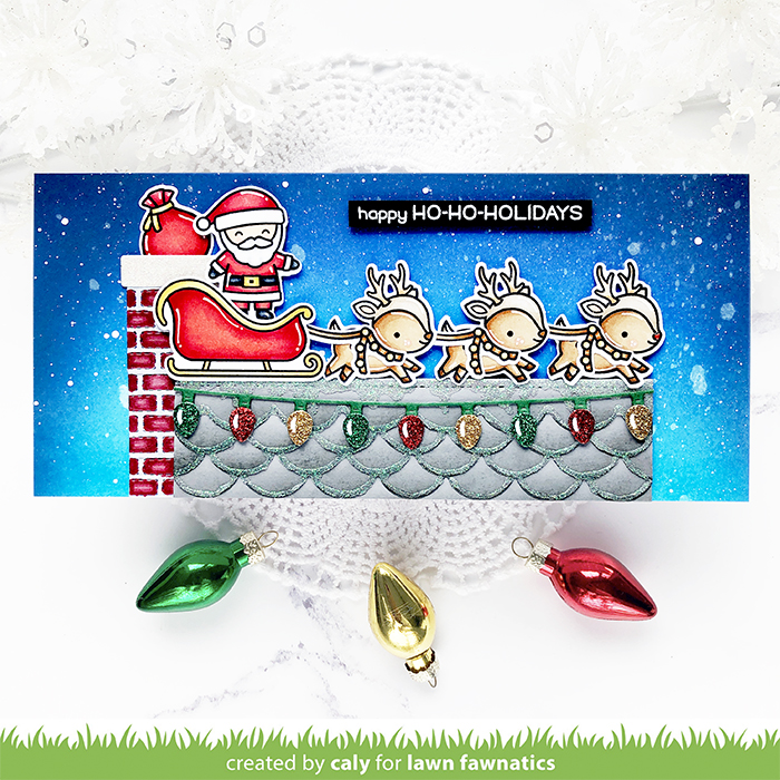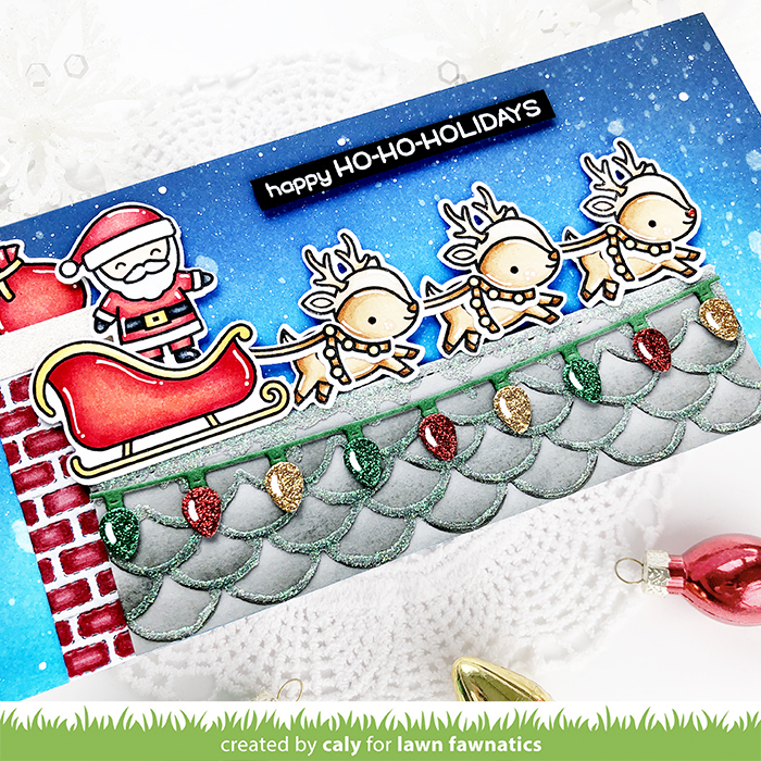 It’s a Fawny Holiday Week on the Lawn Fawn Blog. I’m so excited to be a part of it and have created a festive holiday rooftop scene to share with you! My scene today is on a slimline card that measures 3.75” x 8.25”. I wanted 3 deer on my card and they only way I felt I could make them all fit was to create a longer chimney to lengthen the rooftop area.