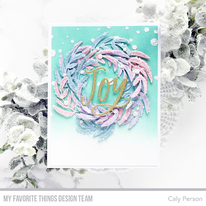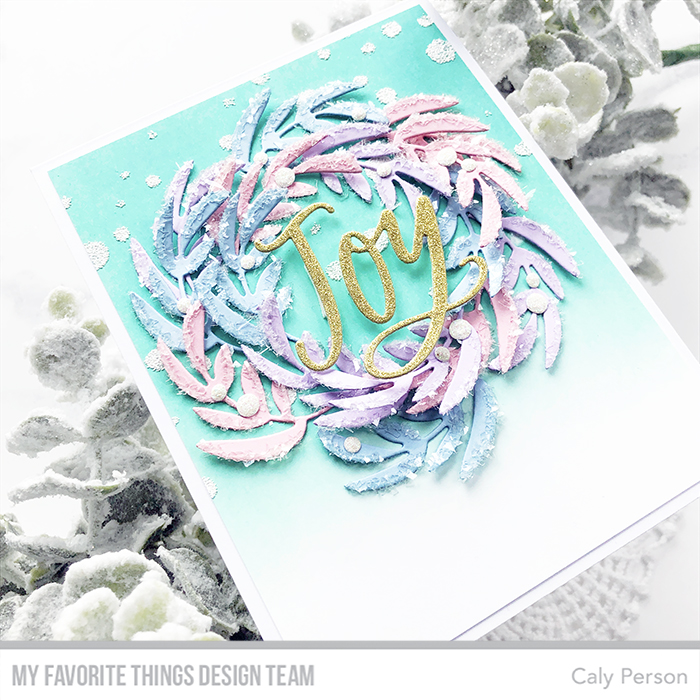 To incorporate my blues, pinks, and purples along with lots of twinkle and snow, I’ve combined a few products to create my Joy Wreath today. I die-cute the Joy Wreath Die-namics out of Tickled Pink, Blue Breeze, and Grapesicle cardstock.