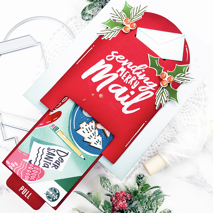 Before adhering everything together, I embossed the sentiment on the mailbox with white embossing powder. I die-cut the mailbox slit and backed it with black cardstock, but only added dry adhesive on the top and sides (so the envelope can still slide in). Then I added my pull tab loosely to make sure I didn’t adhere foam adhesive anywhere that would obstruct the sliding mechanism before adhering it over my cardbase. Finally, I decorated the mailbox with the Merry Mail holly, pine and berry images, added some glitter drops and attached my giftcard using some temporary adhesive. I love how appropriate that Dear Santa Starbucks giftcard is for this project!