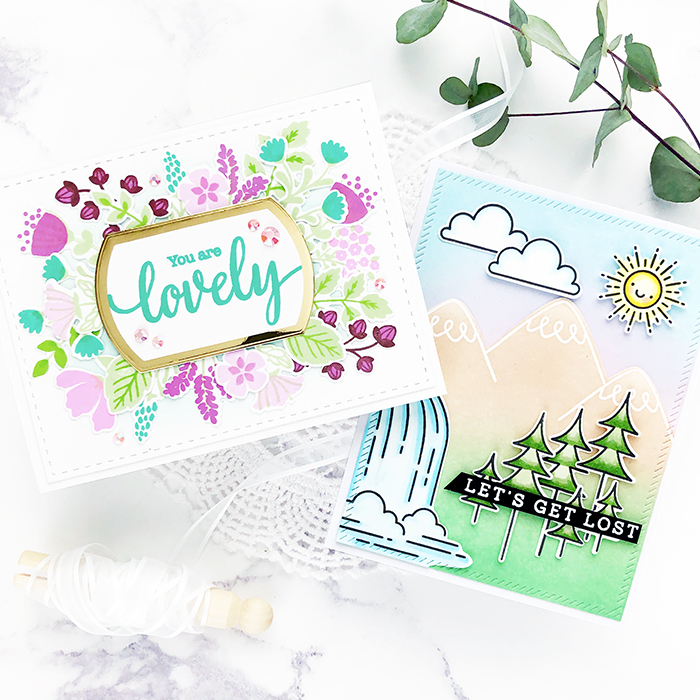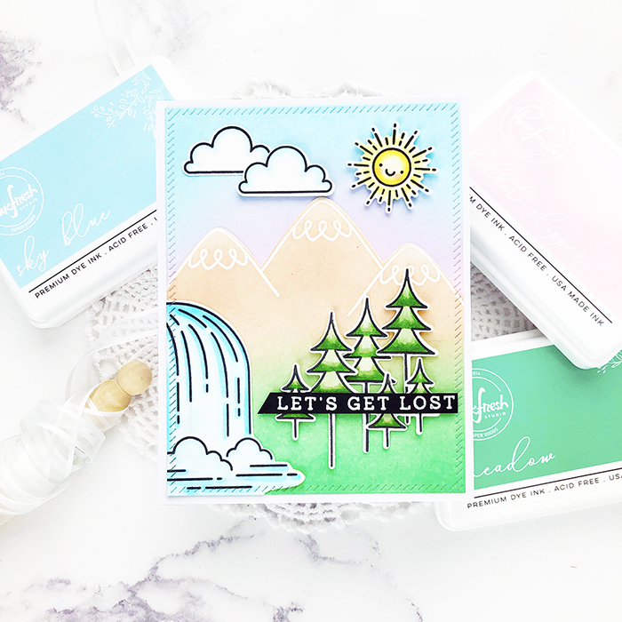 My second card uses the Falling For You set – it’s a whimsy mountain/waterfall scene that makes me want to vacation in Colorado! I ink-blended with Pinkfresh Studio inks and colored the die-cut images with Copic markers.