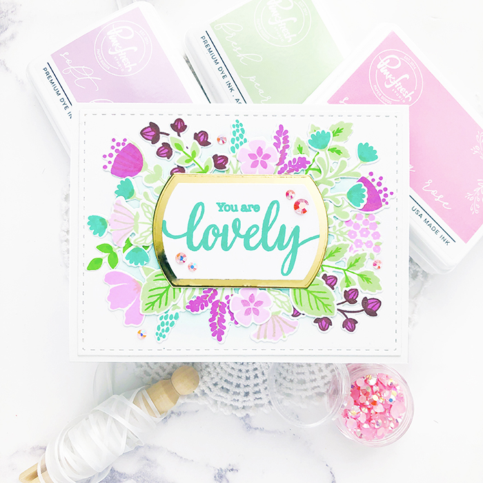 The first card uses the Lovely Blooms stamp set. I created a floral spray around the sentiment. It’s an easy stamp-layering set using Pinkfresh Studio’s new inks!