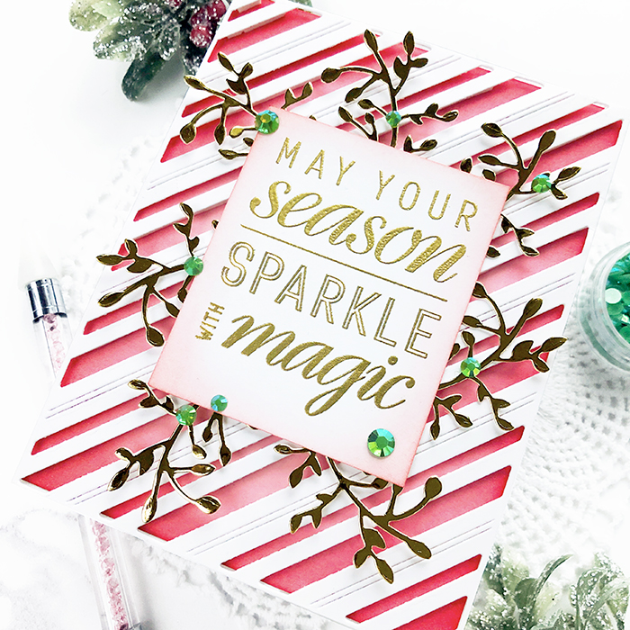 My first card uses the Fancy Diagonal Stripes Die along with the Sparkle with Magic stamp set. I started by die-cutting the Fancy Diagonal Stripes die using white cardstock. To create the red stripes, I used a piece of pink cardstock and ink-blended it with Candied Apple Ink. The frame is adhered to the ink-blended panel with foam adhesive. It gives the card an extra glow and dimension.