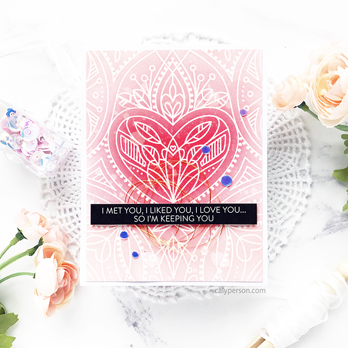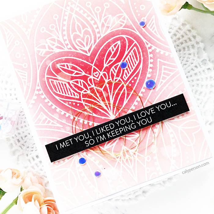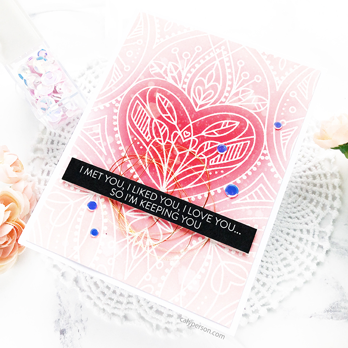 I needed a great background to use these fun sentiment strips on, so I pulled out the Center Cut Heart Background stamp. It’s one of those sets that I have always loved but have never had a chance to use. So I inked it up with Versamark ink and embossed a white panel with white embossing powder to do some resist ink-blending.
