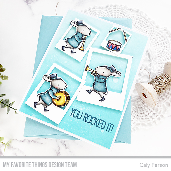 I die-cut the Precious Polaroids in white and added foam adhesive to the back before adhering it over my background and attaching my band images. The last thing I did was stamp my sentiment with Tropical Teal Premium Dye Ink.