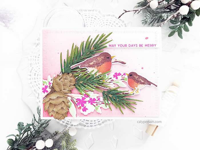 To fill in my scene, I stamped the robins from the Robin & Wren set as well as the Blooming Branches. For my background, I ink-blended Festive Berries and Spun sugar. Then I watered down some Festive Berries ink and splattered it over my panel along with some white paint for interest.