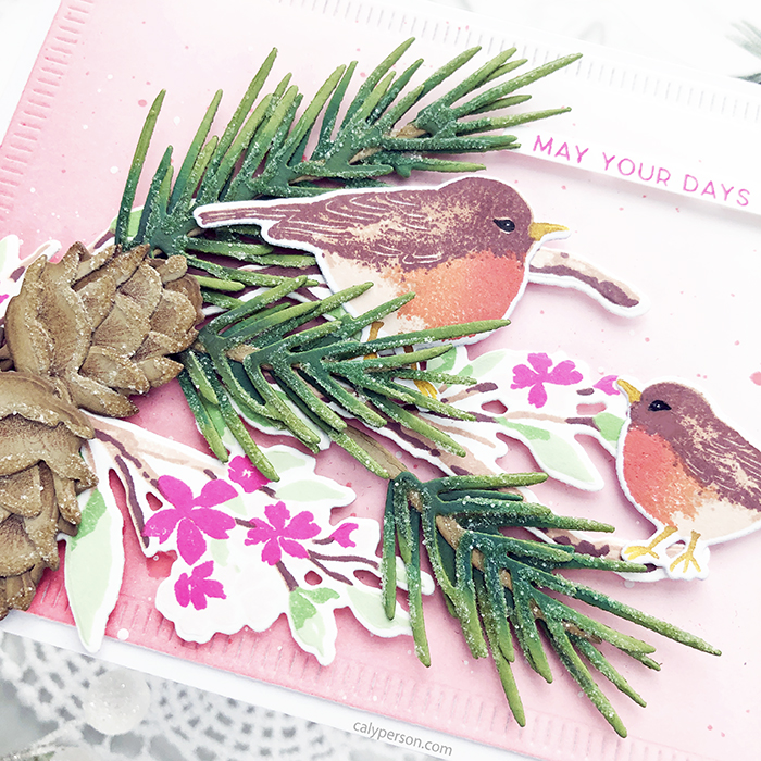 I used quite a few different products for my card today – when you don’t have a lot of time to play – play with as much as you can, right? I have wanted to play with the BotaniCuts Pine Bough set so I started with that. I die-cut the pines and cones and added some color using Distress Oxide Inks (Pine Needles and Gathered Twigs).