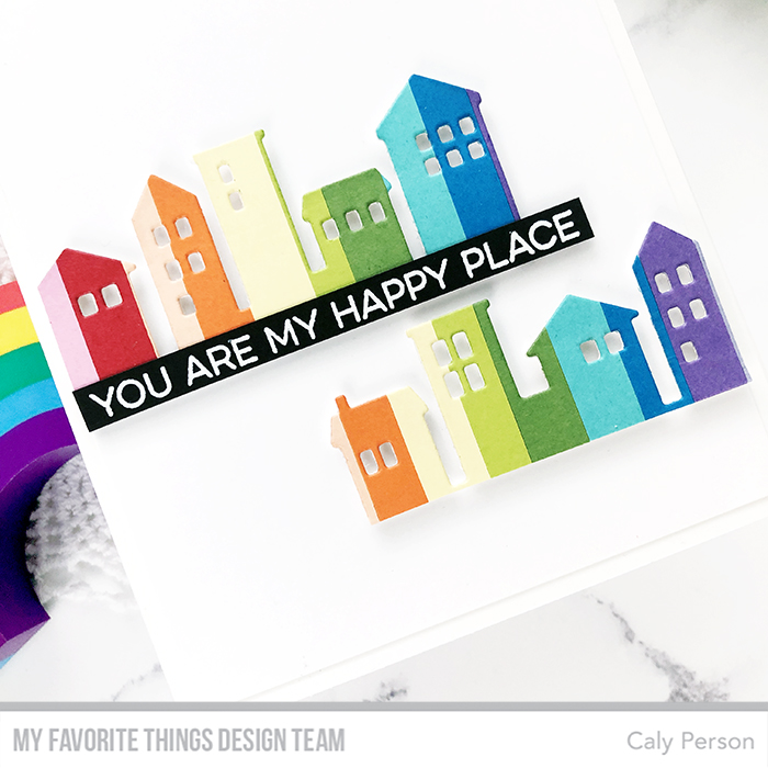Using the Our Town Die-namics, I die-cut the row of buildings/homes twice and added foam adhesive to the back of them before adhering them on a matted A2-sized card front.
