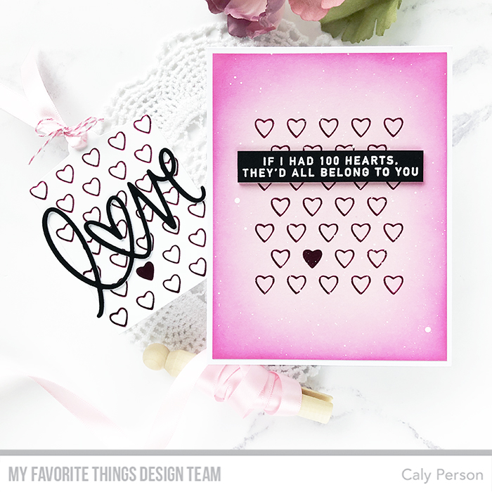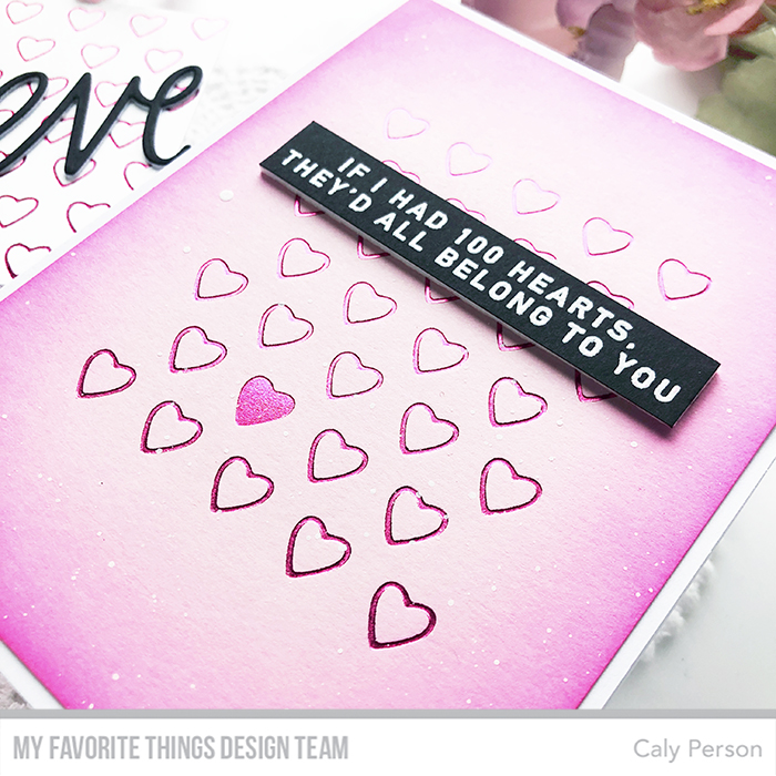 I used the new Trendy Tag Die-namics to frame my foiled hearts and then added the pop of color using the Lots of Love Die-namics by die-cutting a layer in black and two more layers in white to stack the word for height.