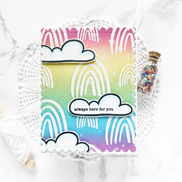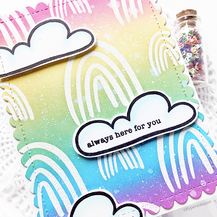 Let’s start with the rainbow card that I made today. I love that there are two sizes of the rainbow on this set. So I used them both to do some repeat stamping to create a pattern that I embossed in white to do some resist ink-blending. I only used 3 colors to create my rainbow today – Worn Lipstick, Scattered Straw and Mermaid Lagoon. By blending these three colors and allowing them overlap, we get an organic reveal of rainbow colors.
