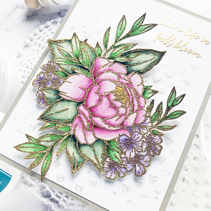 My second card using Hannah’s Massive Peony set is embossed with gold embossing powder over cold-pressed watercolor paper and painted using Daniel Smith Watercolors (Quinacridone Magenta, Hooker’s Green, Sap Green, Carbazole Violet). I braved it and fussy cut all around the image, leaving no border.