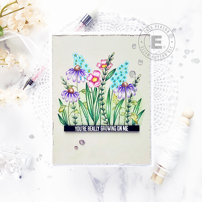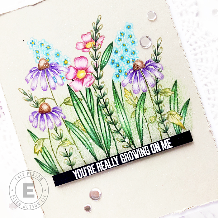 I’m sharing a colored pencil card today using the In the Weeds stamp set from Ellen Hutson. Colored pencils can be such a tedious task but I always love the results when the project is done. The image from this set is really small, but I managed do some no-line coloring also.