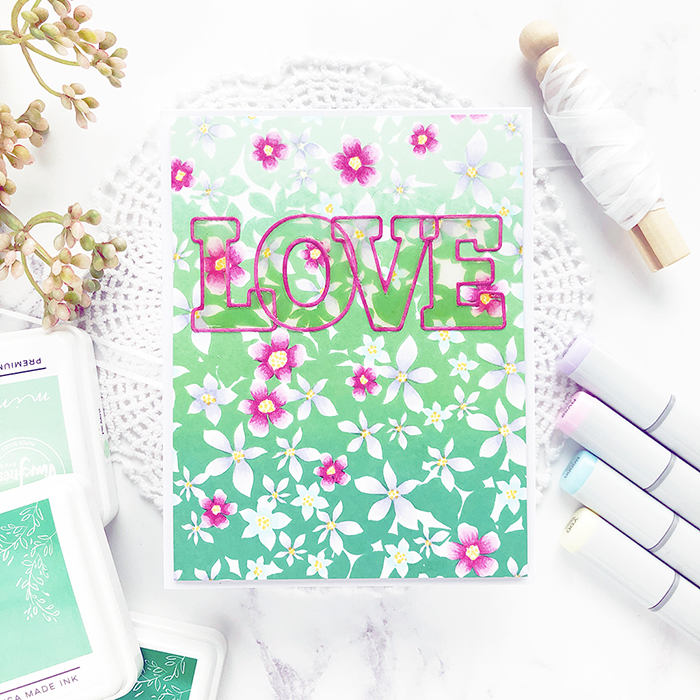 I used Pinkfresh Studio inks in Mint, Meadow, and Emerald City to stamp an ombre fade. After stamping, I used Copic markers to bring the open florals to life.