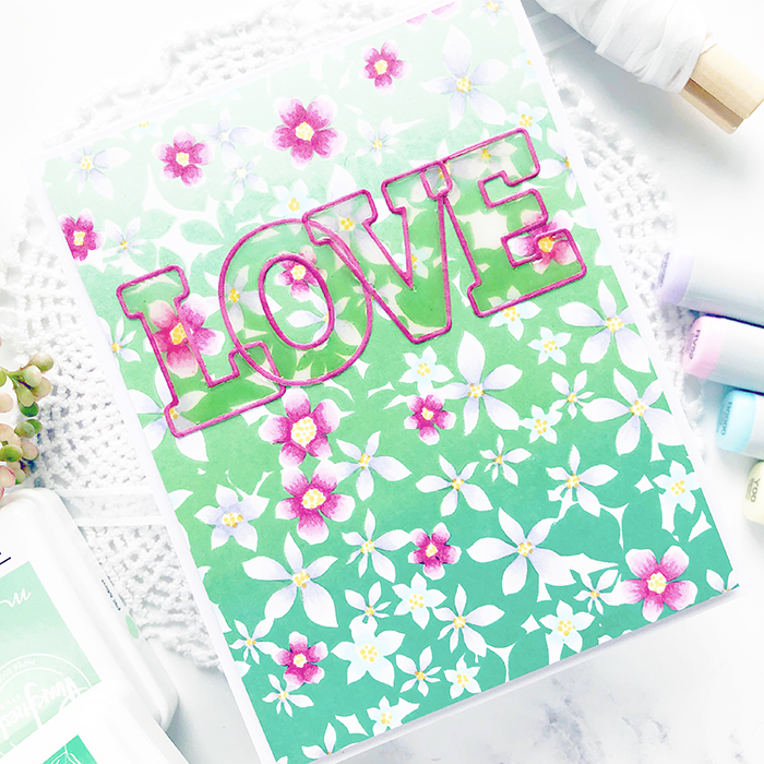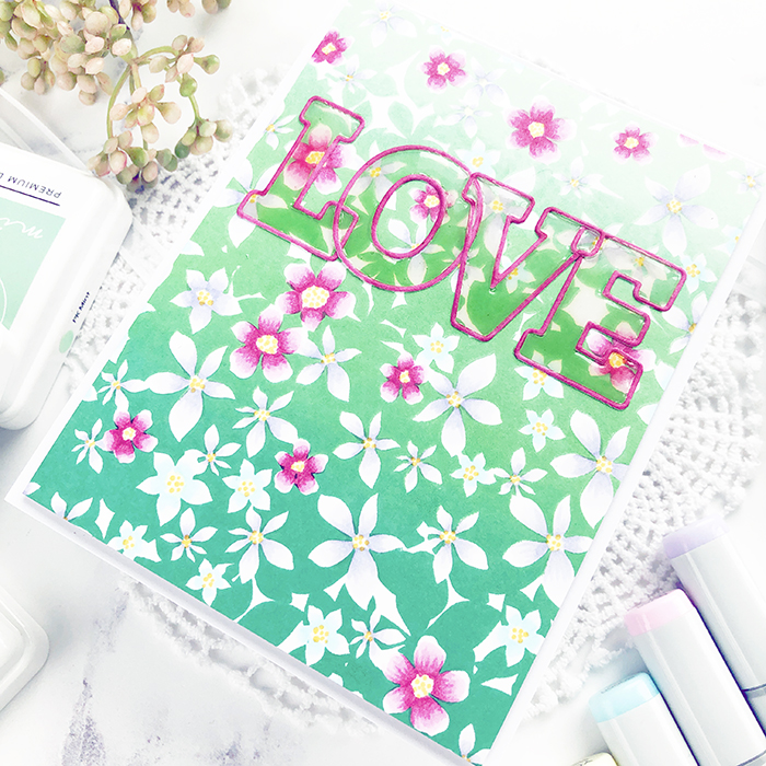 When done, I die-cut the world LOVE using the Adore Alpha die set and used only the outline die because I wanted to keep the focus on the background that I took the time to color. I die-cut the letters in white and colored it with the RV17 marker. Then I used my Clear T-ruler to ensure it lined up straight on my card and adhered it to my background panel and then flooded the letters with clear lacquer to help the word pop, but not not distract too much from the background.