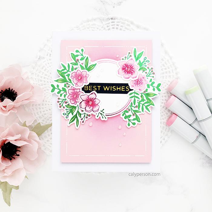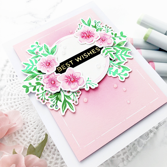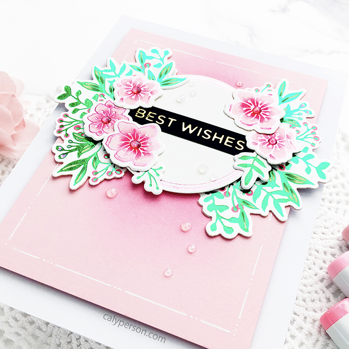I foiled the foliage in green then the flowers and center circle frame in pink. To add some color, I used Copic Markers to fill in the negative space after foiling (V01. V04, G43, G46, RV11, RV13, RV14).