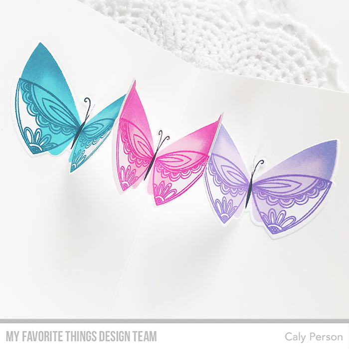 I used the Brilliant Butterflies set to stamp out one large image and 3 little ones for the inside using MFT premium dye inks and kept each butterfly simple in the same color family. To give them some interest, I used darker shades to add color to the outer edges of the larger rings.