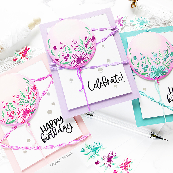 The stamp set I’m using today is called Balloon Bouquet. It’s such a beautiful set and I couldn’t decide on colors so I made a set of 3 using purples, pinks and teals. I stamped my balloons and die-cut each with the Big Balloons die set. I also used the balloon string die from this die set for each card in white and colored them with a Copic marker in a coordinating color.
