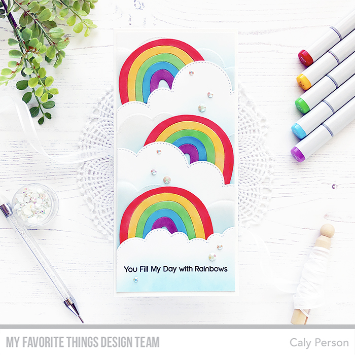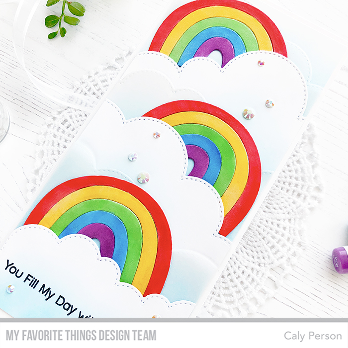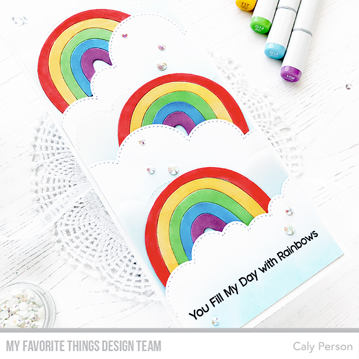I’ve created a slimline card to incorporate more than one rainbow. There are so many rainbow cards these days, so I wanted my card to be a little different. I die-cut three rainbows from white cardstock and colored them with Copic markers (R24, Y17, G14, B14, V06).