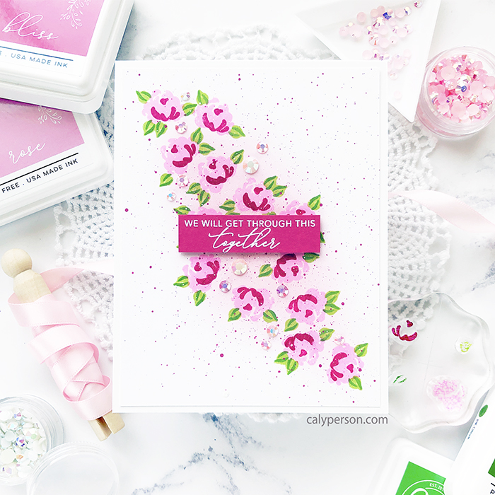 My sentiment is embossed in white over dark pink cardstock to coordinate with the ink colors I used for the flowers (Sparkling Rose and Raspberry Bliss; Grassy Knoll and Olive for the leaves). To finish my card, I added some white and pink jewels.