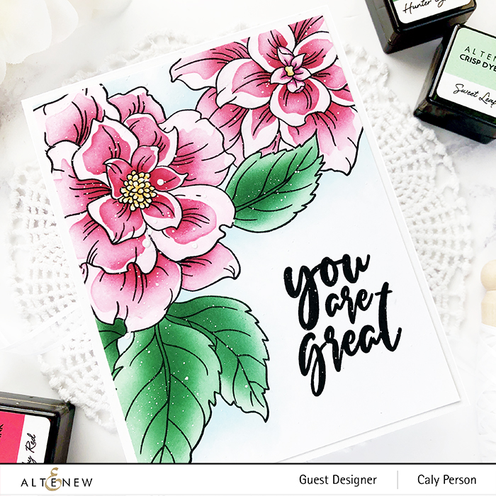 Using the stencil, I ink-blended two shades of pink. First I blended with the lighter (Coral Berry) to cover the entire area of the stencil, then I added the darker shade (Ruby Red) to give the image more depth. The greens I used are Sweet Leaf and Hunter Green. To finish, I colored around the image with B0000, B000 to give it a soft blue glow. I stamped my sentiment and then splattered it with white ink to give it more interest.