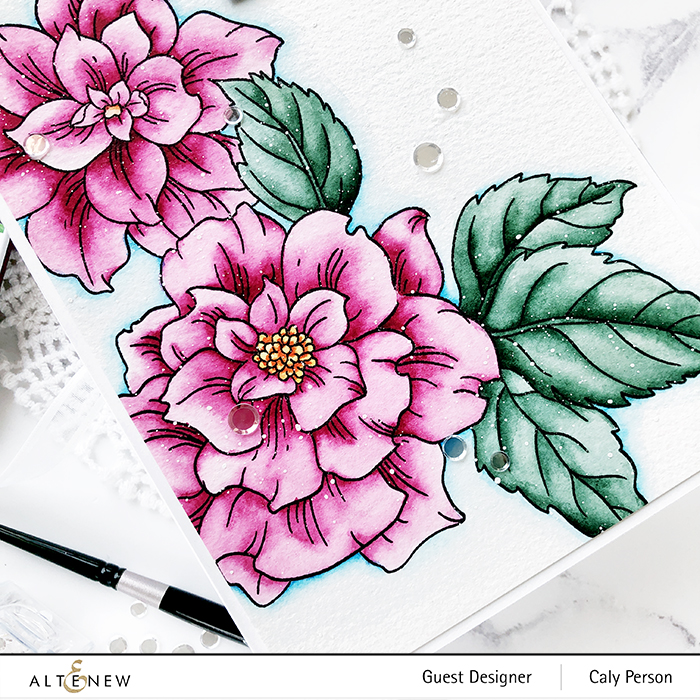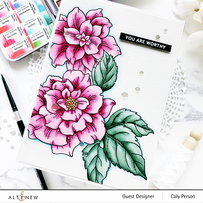 My second card is watercolored using the Altenew Artist Watercolor Pan Set. I painted the flowers with Cherry Blossom paint; Green Meadows for the leaves; Fiery Sunset and Warm and Cozy for the flower center; and Crystal water for the blue edge.