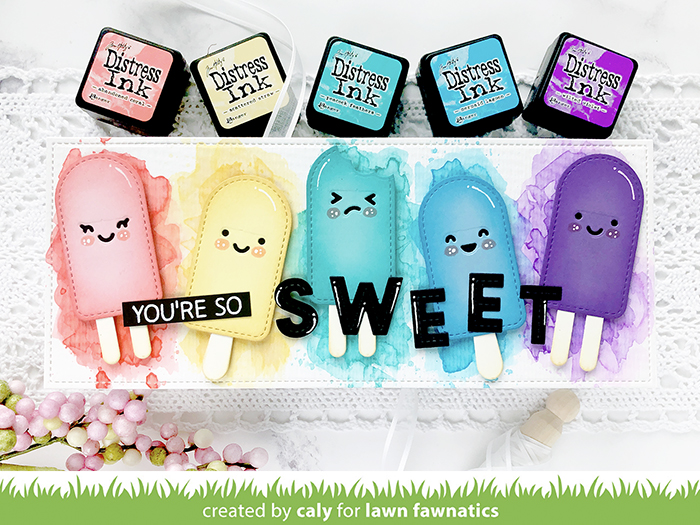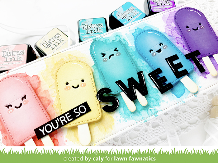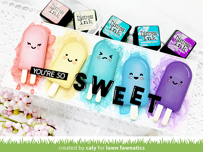Next, I die-cut all of my popsicles in various Lawn Fawn cardstock (Ballet Slippers, Sticky Note, Mermaid, Moonstone, Sugar Plum, Vanilla Malt) and ink-blended it with the same inks I used for the background. I die-cut the faces on each popsicle and backed it with black cardstock. For the blush, I added it directly with an R20 Copic marker.