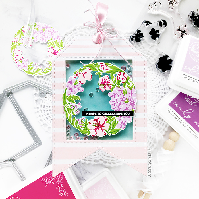 I stamped my wreath using Pinkfresh Studio inks and die-cut the image. Then I stamped my background before cutting out the tag shape and window to create a shaker. I cut an extra tag to ink-blend it with blue ink to give it some color before adhering it all together.
