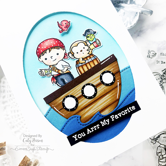 I’m trying challenge myself to create new and fun scenes using Stamptember sets and today, I decided to make a boat/ship for the characters. I used an oval die to die-cut brown cardstock, then drew lines for planks before adding Copic markes to add dimension. For the portholes, I punched 1/2″ circles in white, colored a black ring around the outer edges and then added little dots using a white gel pen.