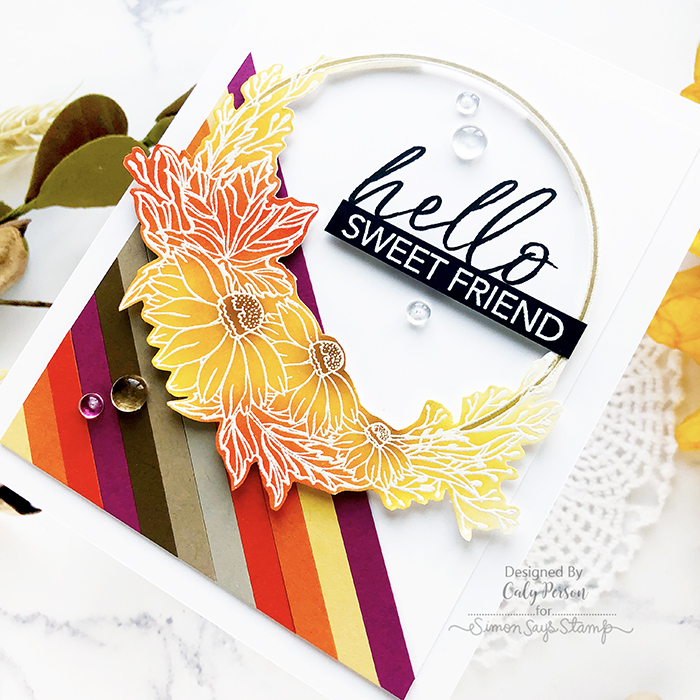 I didn’t have the dies, but I felt the need to fussy cut around and inside the wreath for today’s card! To ogive the background some color, I cut quarter-inch strips in coordinating fall colors and adhered them to a white panel at a diagonal, then adhered the wreath image over it using foam adhesive.