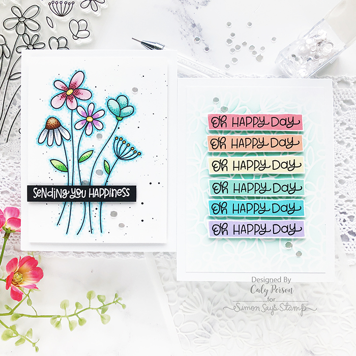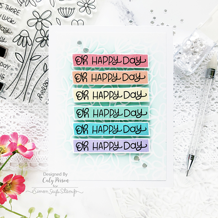 For my second card, I ink-blended the background using the Freestyle Flowers Stencil and with Spring Rain ink. I decided to use the Oh Happy Day sentiment and stamped them on stamped sentiment bars from the stamp set using Simons Says Stamp ink colors in Teeny Bikini, Apricot, Lemon Chiffon, Spring Rain, Audrey Blue, and Lavender. To finish, I also embellished this card with a few clear confetti.
