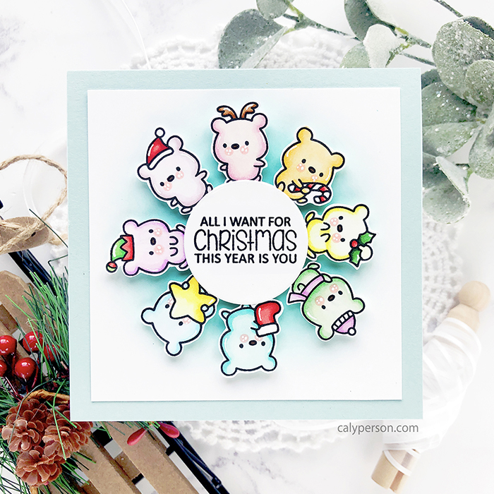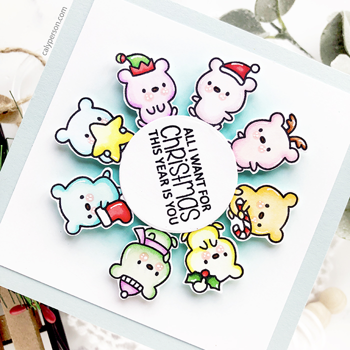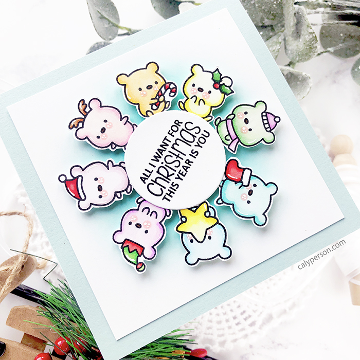 I’m a guest for Clearly Besotted for their holiday release and today, I’m sharing inspiration using the Naughty or Mice? set! These new goodies go live on October 1st and links will be updated so you can shop then! Goodness, these tiny critters are so cute! I stamped a bunch and colored them with Copic markers to create a spinner card!
