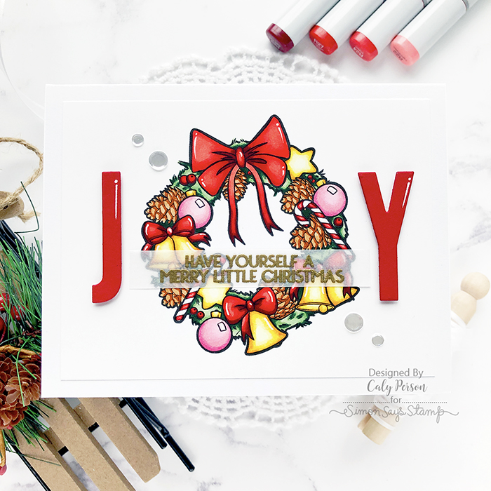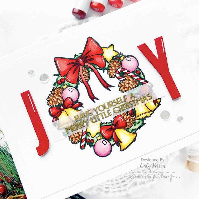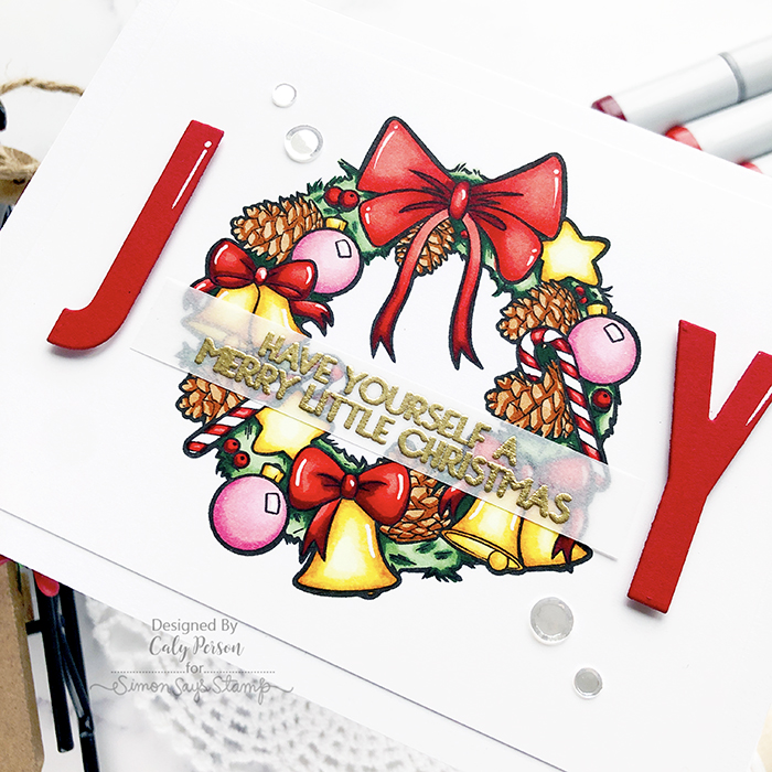 When done, I die-cut the letters J and Y so I could use the wreath as an O to spell JOY. I adhered the J and the Y with foam adhesive to give my card some dimension and added some white gel highlights to give everything a bit more interest.