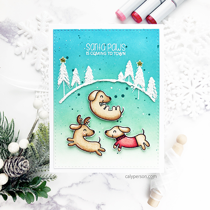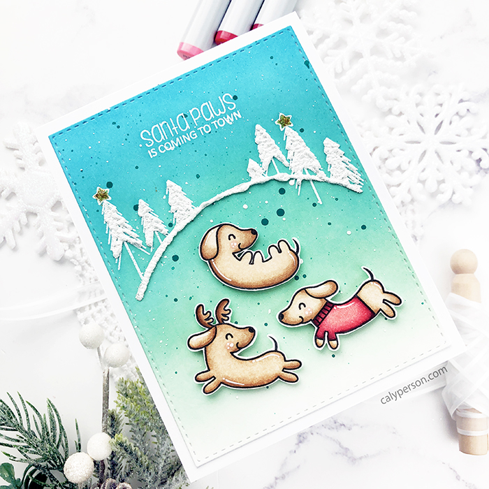 1. Oh this is so cute, Caly! I love those snowy trees and the fabulous colour combo in the background. Those pups are coloured beautifully too!