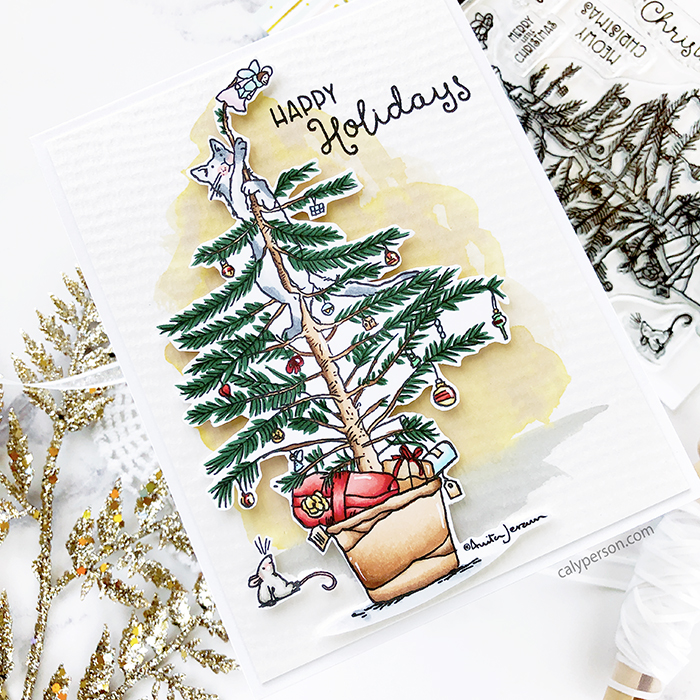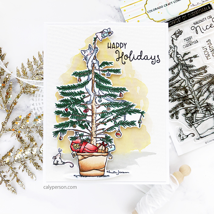 I’ve created a second card using the new line illustrated by Anita Jeram for Colorado Craft Company. Today’s card uses a fun set called Christmas Tree Cat.