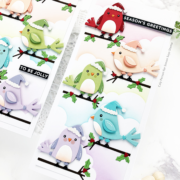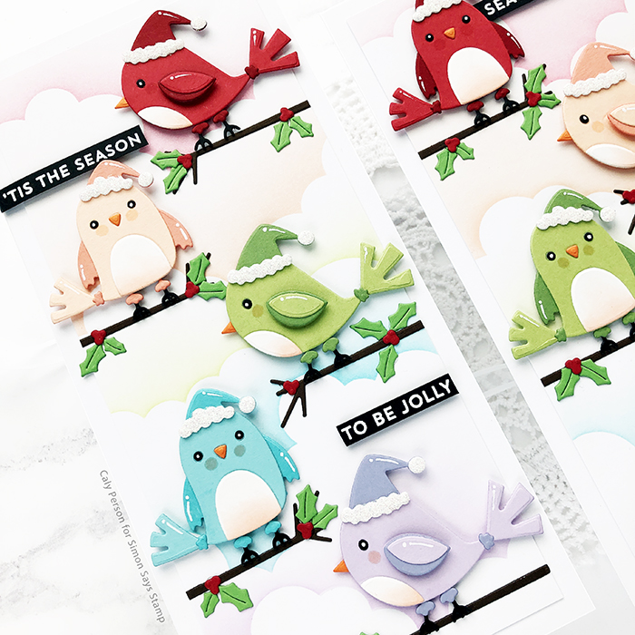 I’m so excited to share today’s cards with you. I worked extra hard on them and love how they turned out and I hope you’ll like them too! I used the My Favorite Things Holly Jolly Cardinals to create a fun winter/holiday card.
