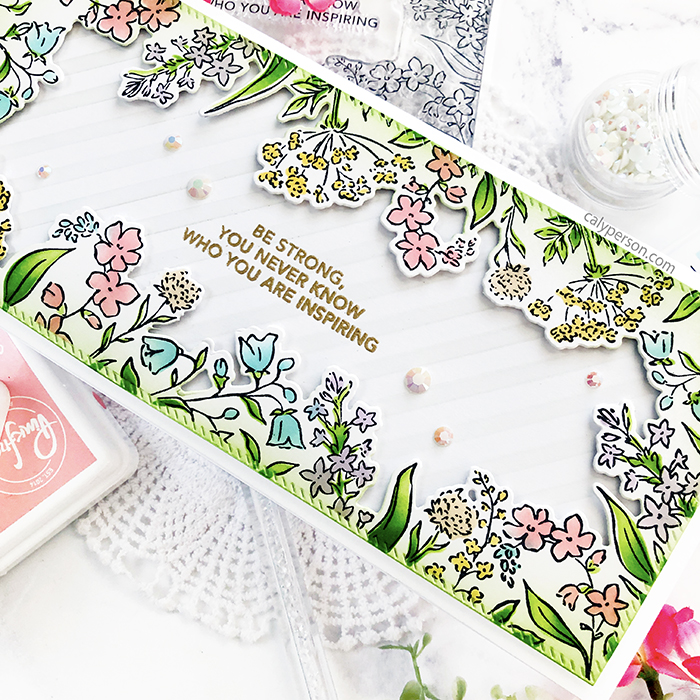 Today’s card features the Be Courageous stamp, die, and stencils. You could very well color after stamping this set, but I wanted to use the stencils to show you that you can add color with ink using the easy layering stencils! I used a variety of inks to make my card extra colorful – without having to mask (Grassy Knoll, Olive, Lemon Whip, Peach Fuzz, Sky Blue, Soft Lilac, Coral Reef).