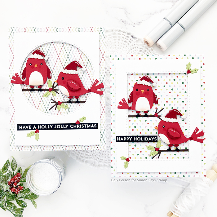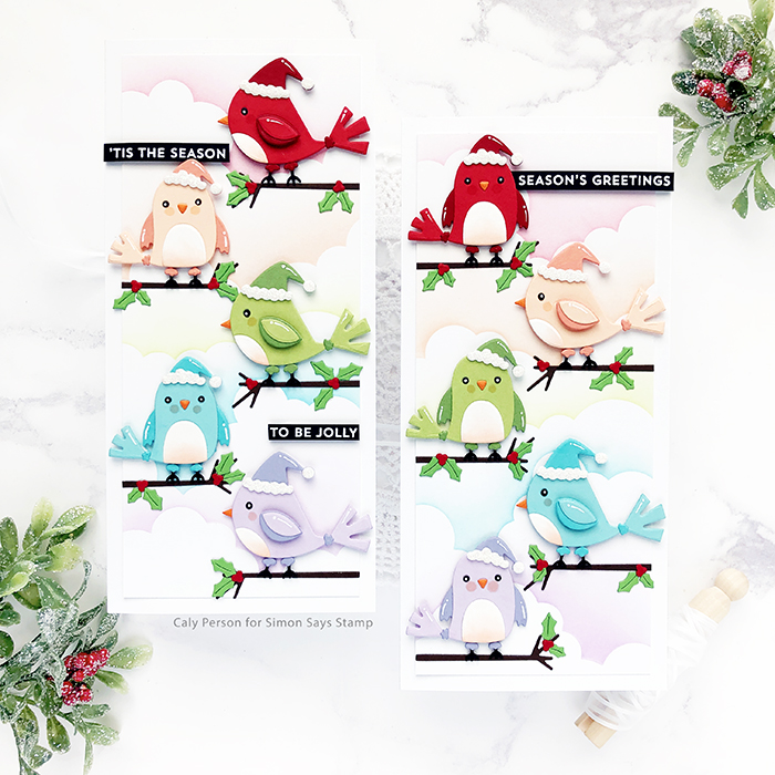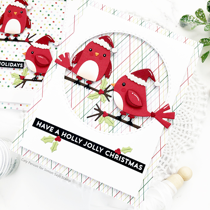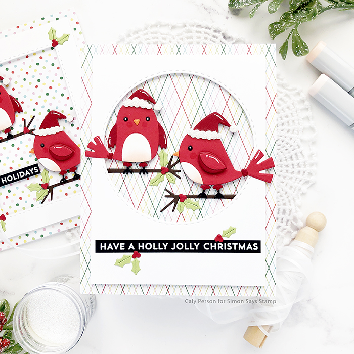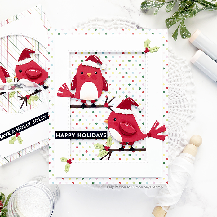 I’m back again with these adorable Holly Jolly Cardinals from MFT. I shared rainbow cards a week ago. I had die-cut a bunch of them and I had more to create with so I made two more cards using these cardinals. If you missed it, here’s a photo of those rainbow cardinals again: