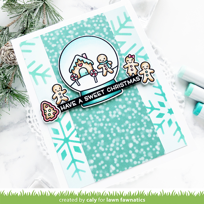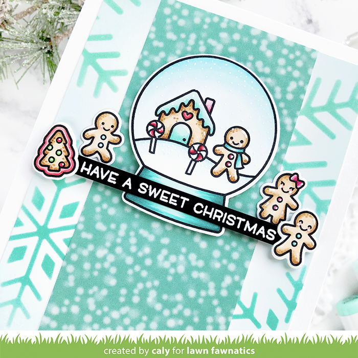 I knew right away I wanted to use the Snow Globe Scenes to replace the heart element on this card since the holidays are upon us. I love that gingerbread man so much that I also used the Tiny Gingerbread set to add more images to my card. I stamped and colored these images with Copic markers.