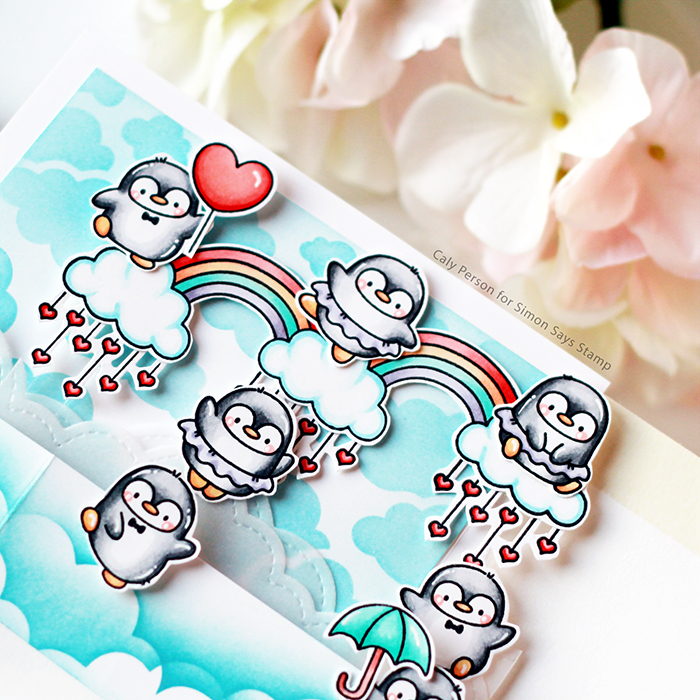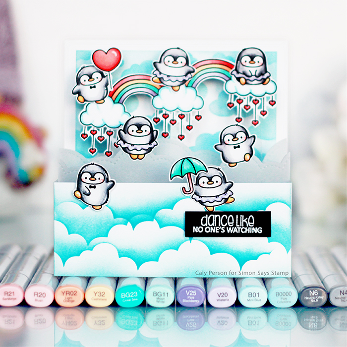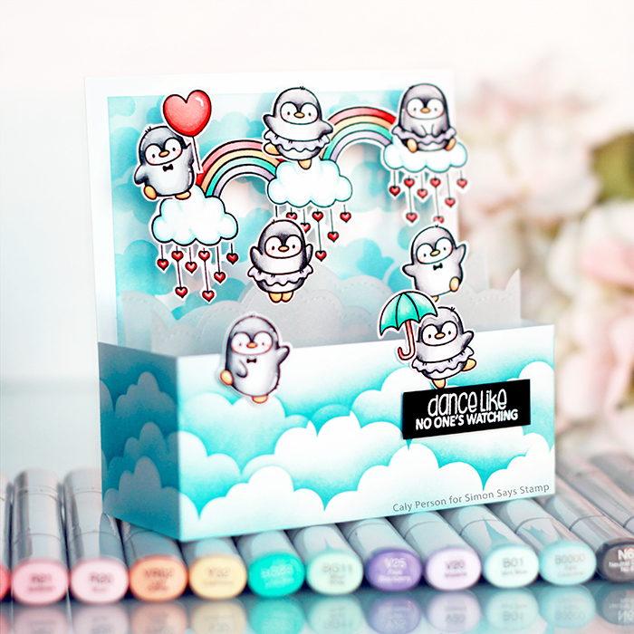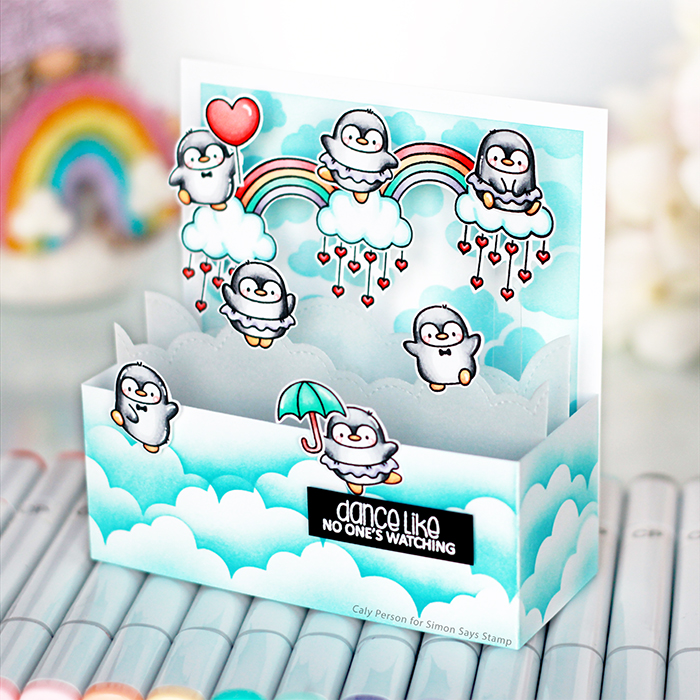 For my inserts, I cut them from vellum using Lawn Fawn’s Puffy Cloud Borders dies. Before assembling my box, I ink-blended clouds onto the box panel at the bottom using the Clearly Besotted Cloudy Day Stencil. Then I cut a second panel to to mat my back panel and ink-blended more clouds from the same stencil.