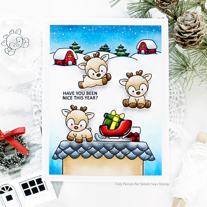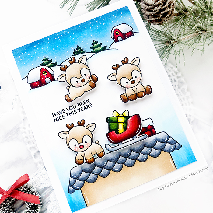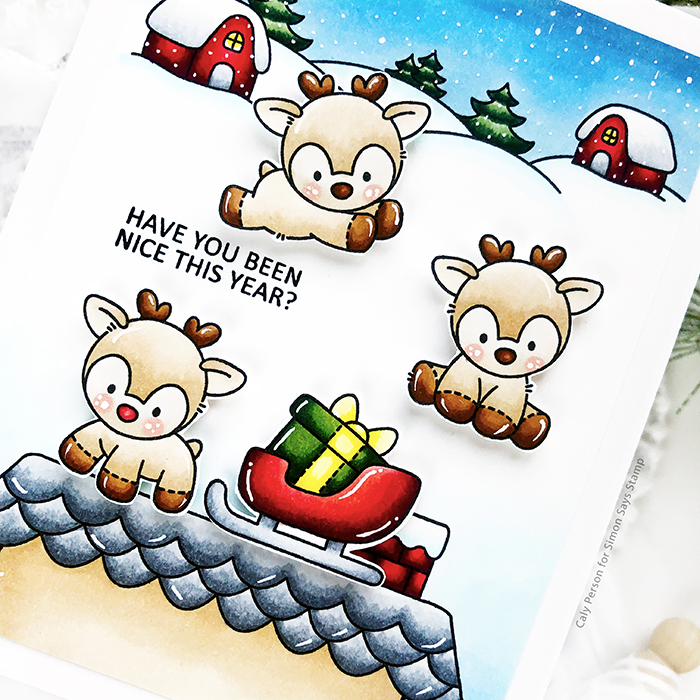 I stamped the scenic image along with the rooftop on a blank panel and colored them first. Then I stamped my sleigh and reindeer on a separate sheet of cardstock to color so that I can cut them out to adhere with foam adhesive for dimension.