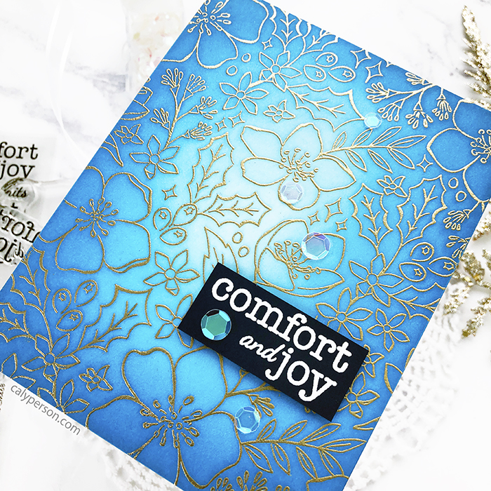 I matted this card panel to a dark blue A2-sized panel and embossed the sentiment over the same color cardstock. To finish, I added a few iridescent sequins.