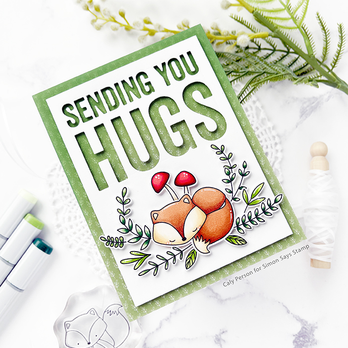 I love large word dies from MFT and this Sending You Hugs die is a smaller one that doesn’t take up the whole panel, giving me lots of room for an image or images for a scene. I paired it with the Let’s Curl Up set to create a little foliage spray for my adorable fox.