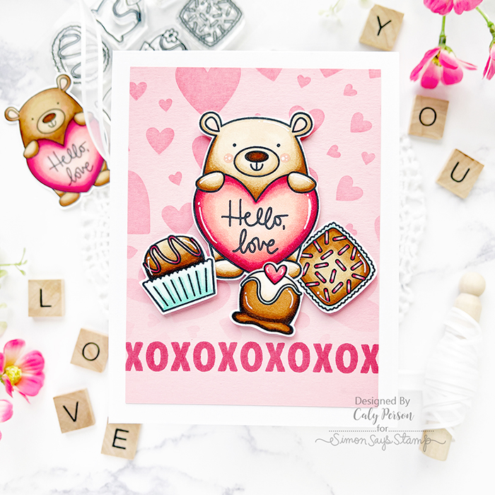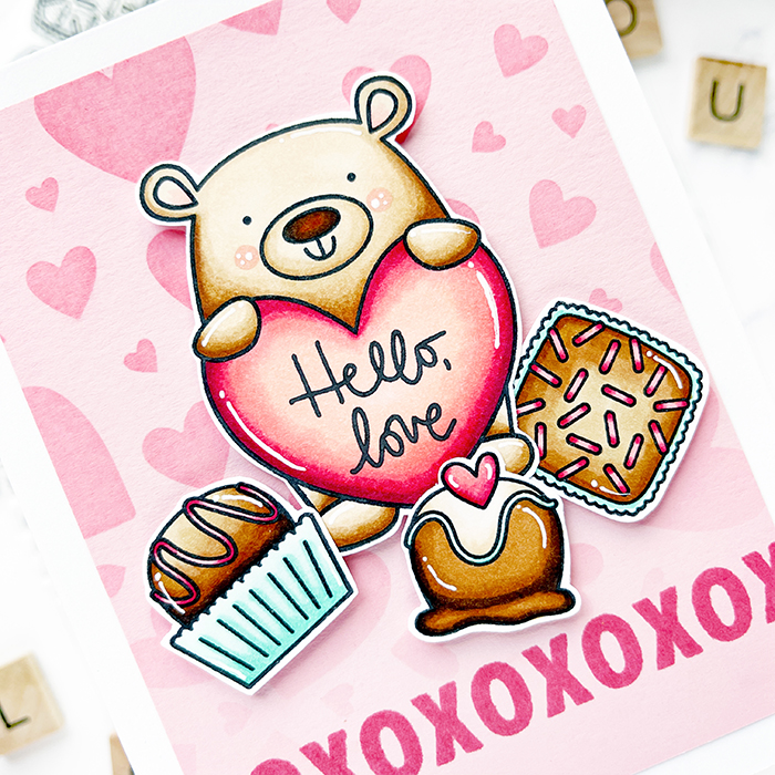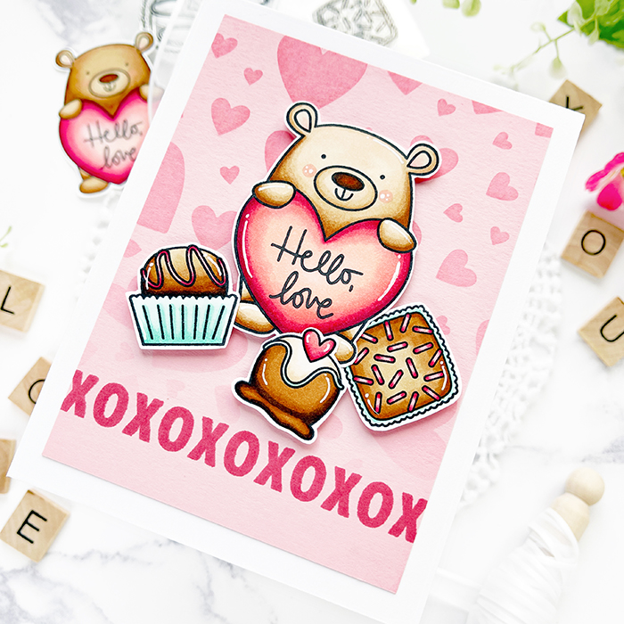 My background uses the Tumbling Hearts Stencil from the kit. I ink-blended with Festive Berries Distress Oxide Ink and faded from top to bottom over Cotton Candy Cardstock. To create a grounding, I stamped the XOXO border from the Love You Beary Much set at the bottom using Watermelon ink.