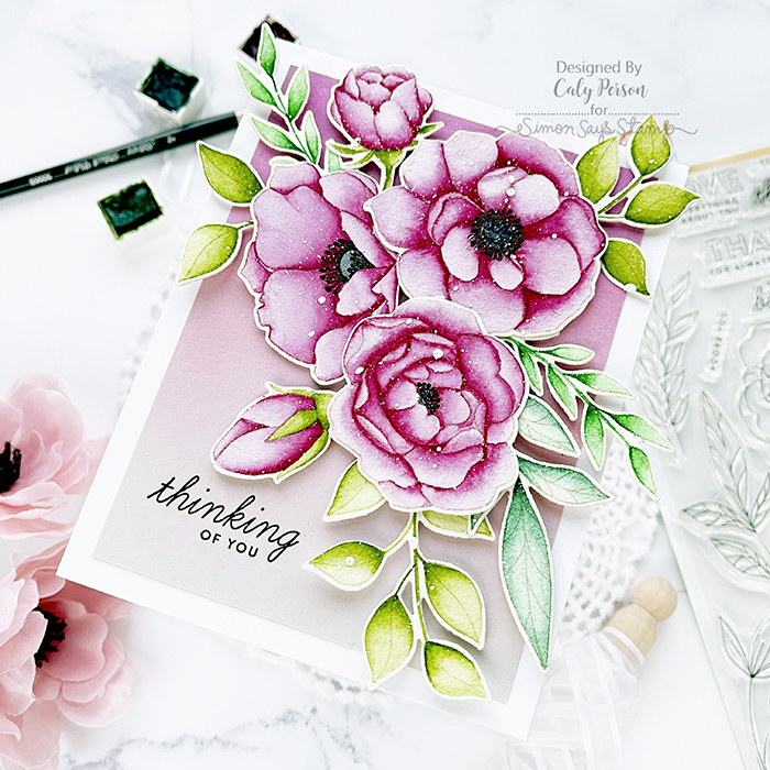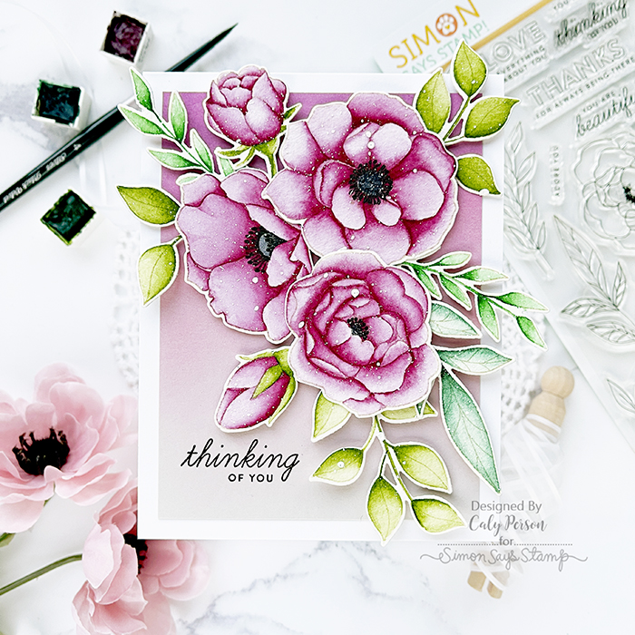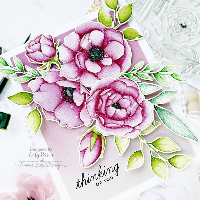 I splattered the painted images with white paint after die-cutting them then set them aside to work on the background. My background is ink-blended with Seedless Preserves and Worn Lipstick over Fog cardstock (I do this A LOT). I just love it and I don’t think I’d be happy with another combination on my watercolored florals.