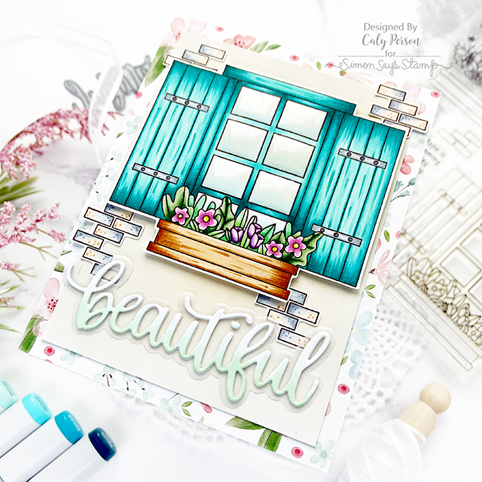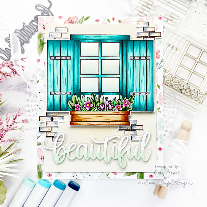 I love the Spring Windows set – there are two window styles to choose from and I chose this big one with the shutters. The kit does NOT come with dies and I had to fussy cut, but I’m linking dies for you. I stamped and colored my window and brick accents with Copic markers.