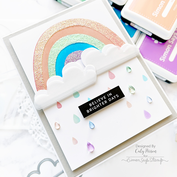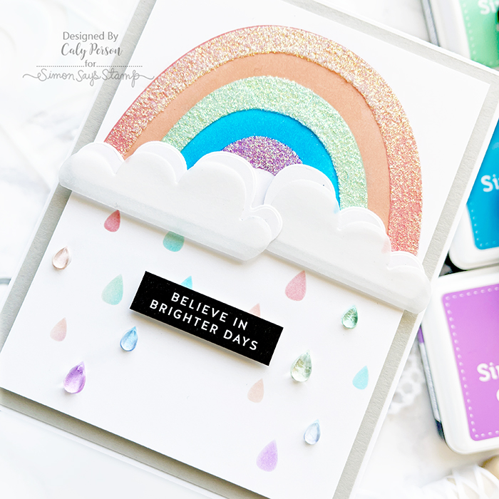 The stencil is easy to use and each band stacks perfectly over the next. I used Simon Says Stamp ink to ink-blend each band and then used the same stencil to stencil on rainbow raindrops. To give it more interest, I added Glitz Glitter Gel over a few of the bands and attached Teardrop gems over a few of the raindrops.
