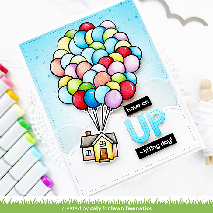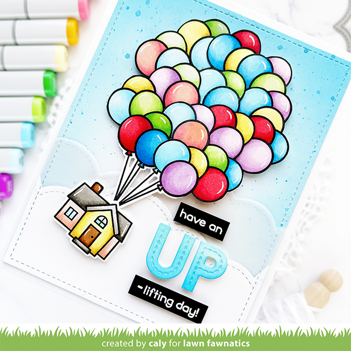 I stamped lots of balloons and a house and colored them using Copic markers. I didn’t have to, but I fussy cut the tops of the balloons to make them look more like they’re a part of a single image.